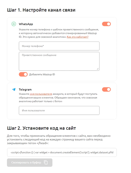 На сайте Widget Profeat Вам нужно указать номер своего телефона и составить шаблон для сообщения-приветствия. После автогенерации к нему добавится Wazzup ID. Всё это понадобится для сквозной аналитики. Обратите внимание! Ползунок добавления Wazzup ID должен быть включен и подсвечен.