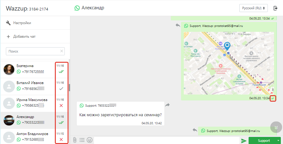 В WhatsApp можно проверить, прочитал ли клиент сообщение. Если нет — напомните о вашем запросе. Посмотреть статус сообщения в WhatsApp при интеграции с EnvyCRM можно в личном кабинете Wazzup — в специальных чатиках сервиса.