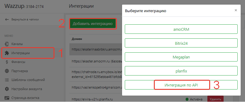 Чтобы установить WhatsApp в EnvyCRM, сначала нужно пройти регистрацию в Wazzup. Далее перейдите в раздел интеграций и добавьте ее по API.