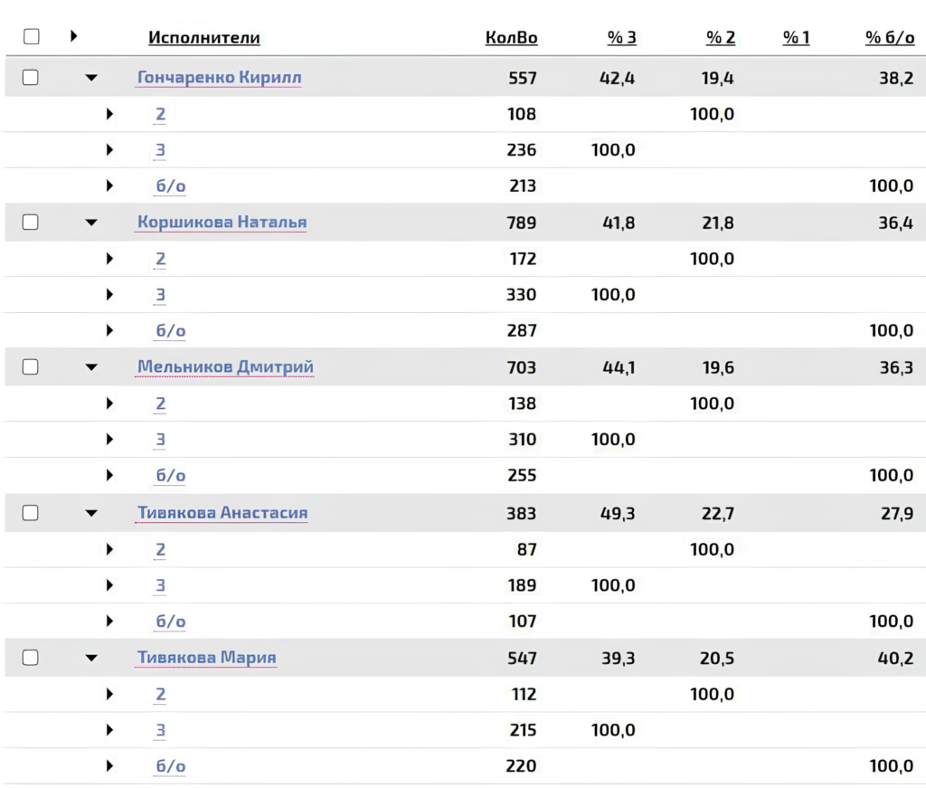 Наш бот автоматически предлагает клиенту оценить техподдержку, как только проблема решена, а клиент еще тепленький и благодарный. Статистика оценок выглядит так: