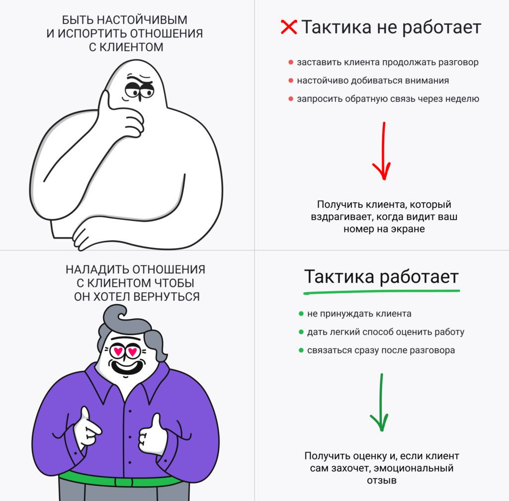 Всю проделанную работу с клиентом легко обнулить, если навязчиво звонить и выпрашивать у него оценку. Клиент достиг своей цели — решил проблему, получил товар или услугу и справедливо считает, что на этом общение с компанией закончилось.