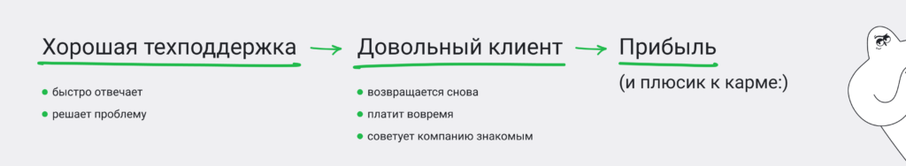 Чтобы клиент остался лояльным и не пошел налево, обращаться в техподдержку должно быть приятно или хотя бы не страшно. В конечном итоге заботливая компания получает не только плюсики к карме, но и прибыль.
