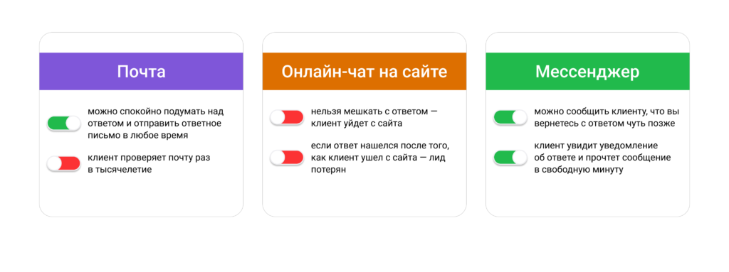 В плане скорости и удобства работы с клиентами WhatsApp, Telegram, Instagram, ВКонтакте и прочие приложения на голову выше почты или онлайн-чатов. Достаточно телефона, чтобы связаться с саппортом разными способами: