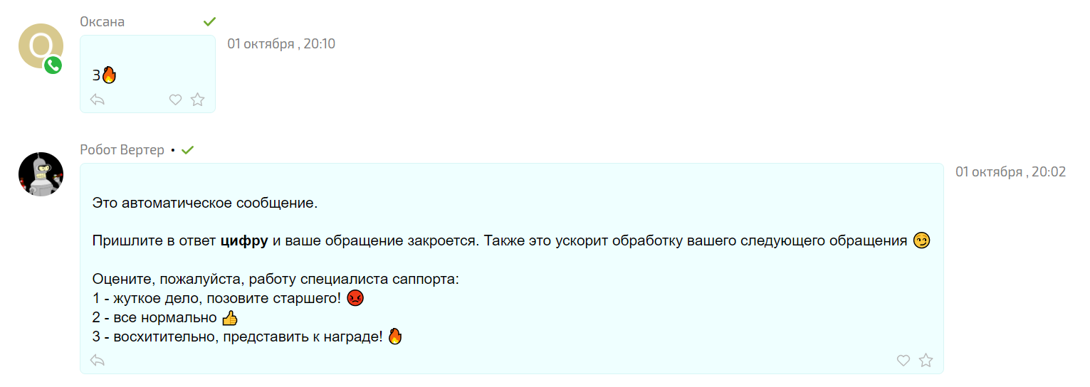 Это не значит, что получить обратную связь и не разозлить клиента невозможно. Сделайте так, чтобы поставить оценку было легко. Например, наш бот Робот Вертер в конце диалога присылает шаблонное сообщение с предложением оценить работу саппорта с клиентом. Всё, что требуется от пользователя — отправить одну цифру или проигнорировать сообщение.
