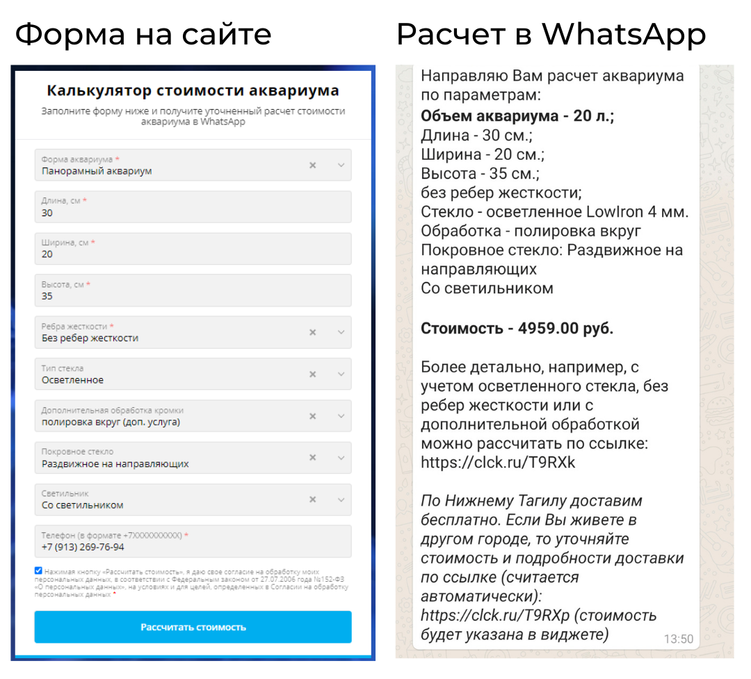 В анкету автоматически подставляется номер телефона клиента. После отправки формы, в WhatsApp приходит новый расчет стоимости.