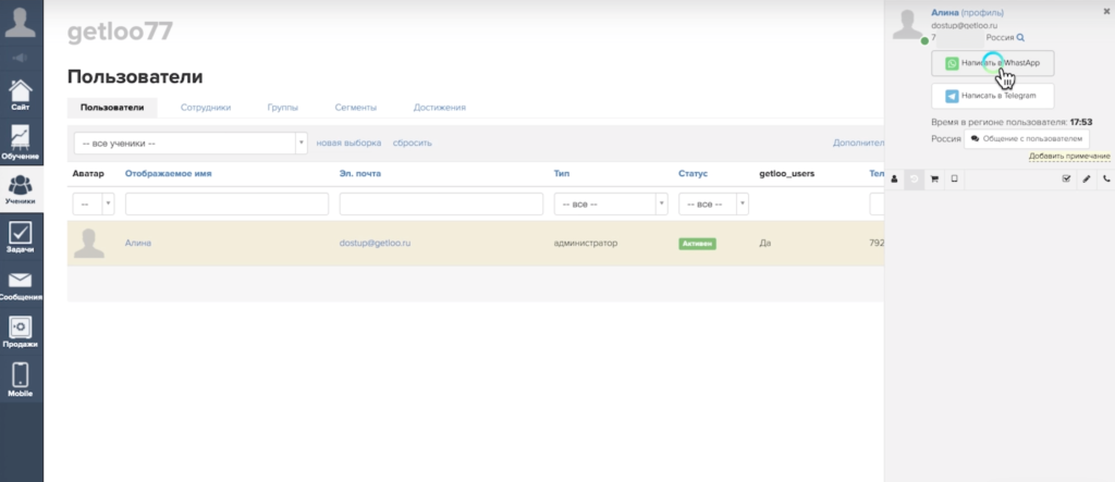 - Протестируйте интеграцию прямо на Геткурсе. В разделе «Пользователи» выберите любую карточку контакта, в которой есть номер телефона клиента. Появилась кнопка «Написать в WhatsApp». С ее помощью теперь доступна отправка сообщений пользователям в мессенджер. Если клиент ответит на ваше сообщение, переписка отобразится в системе.