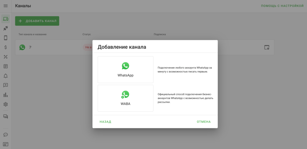 - Пройдите регистрацию и добавьте канал WhatsApp.