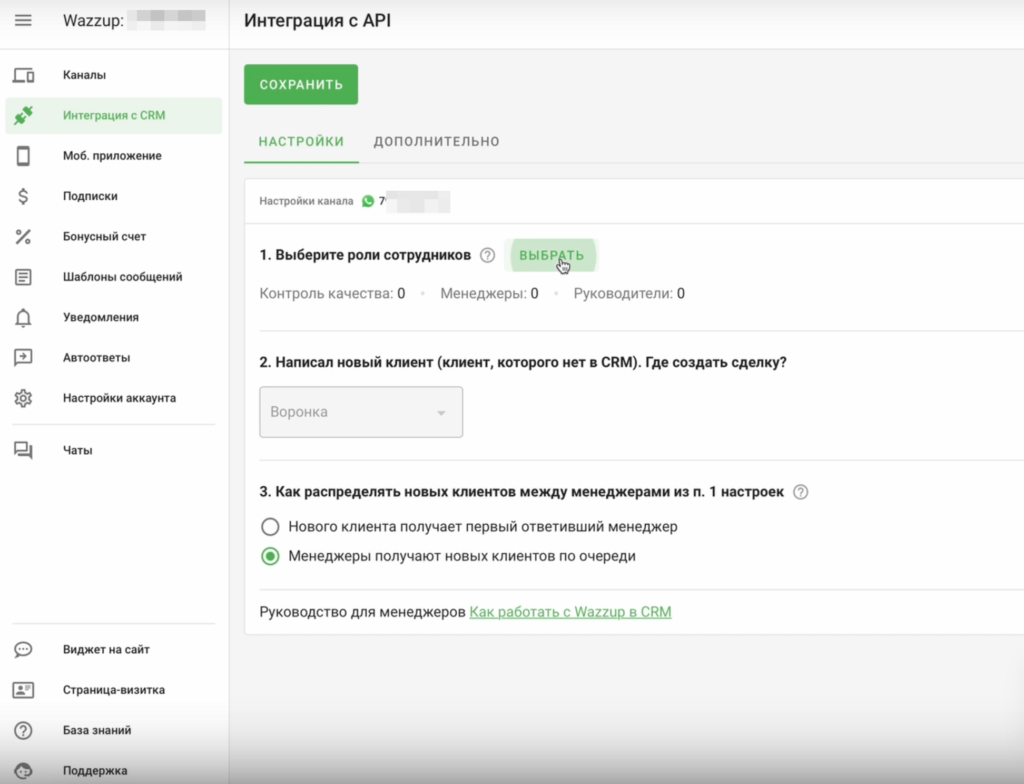 - Откройте вкладку с Wazzup. Выберите «Интеграция с CRM», а затем — роли сотрудников. Отметьте галочкой нужное. Подтвердите изменения.