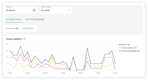 График «Новые диалоги» отображает, сколько клиентов или сотрудников начали новый диалог в конкретный день или период времени. Считаются только те диалоги, в которых раньше не было сообщений.