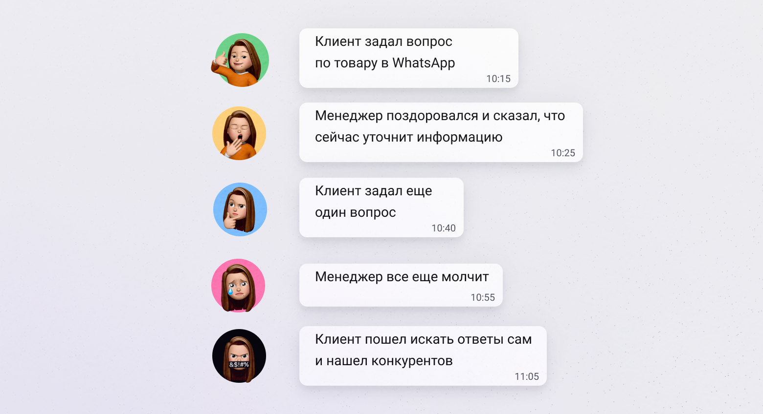 Старания десятков сотрудников и деньги на привлечение легко слить. Достаточно в конце цепочки посадить менеджера по продажам, который не умеет грамотно выстраивать переписку или быстро отвечать клиентам в мессенджере.