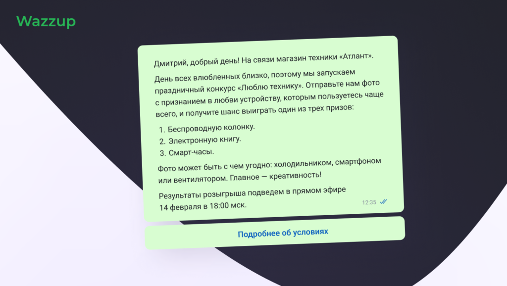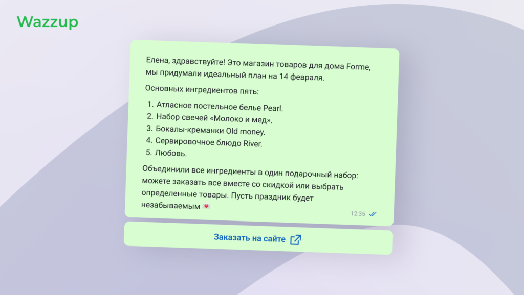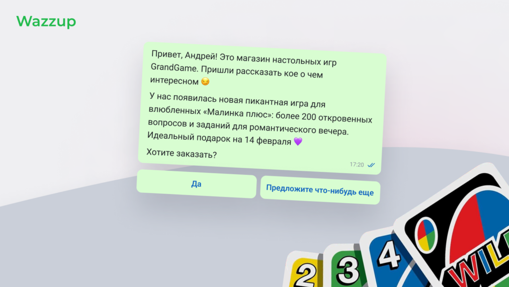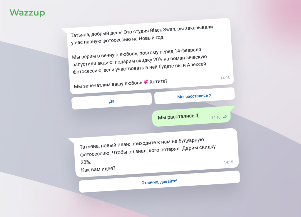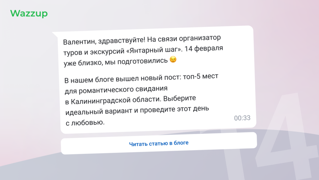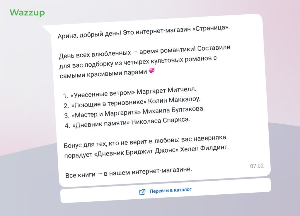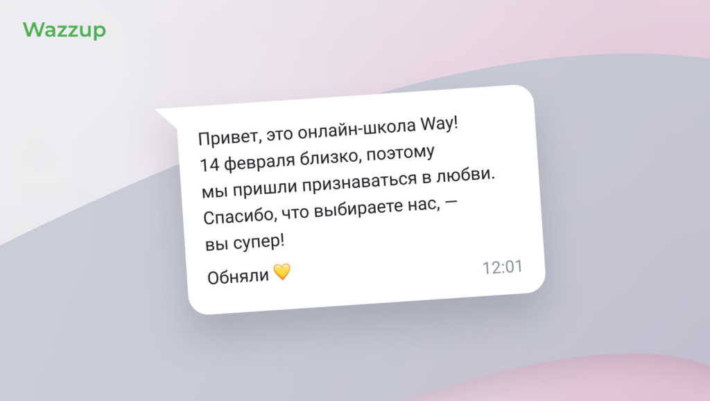 День всех влюбленных — шанс позаботиться о клиенте и поднять продажи, а один из способов это сделать — рассылки. Собрали восемь идей для WhatsApp-рассылок, которые клиенты точно откроют и прочитают.