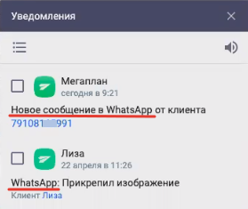 Вы также можете включить автоматическое назначение ответственного сотрудника на новых клиентов в настройках Мегаплана. Все последующие сообщения от клиентов попадают в журналы их карточек. Сотрудник получит уведомления о каждом новом сообщении. Клиентов можно фильтровать и определять, кто именно пришел из WhatsApp.