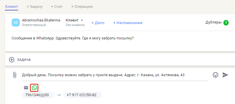 Кликните по кнопке с изображением телефонной трубки и ответ будет отправлен клиенту в WhatsApp.