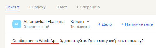 И да, если вам пишут с незарегистрированного в вашей системе ранее номера WhatsApp, то автоматически будет создана карточка типа «Клиент». В начале основными данными такой карточки будут являться цифры номера телефона, а аватар заменит лого WhatsApp. Это относится к первому сообщению, дальше данные клиента будут расширять его «Контактные данные» в одноименном блоке.