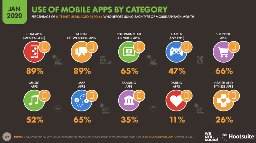 Исследование международного агентства We Are Social и сервиса Hootsuite показало, что ежедневно в мобильных приложениях мы проводим около 3 ч. 22 мин. Первое место по посещаемости занимают мессенджеры и социальные сети. Они установлены у 89% пользователей.