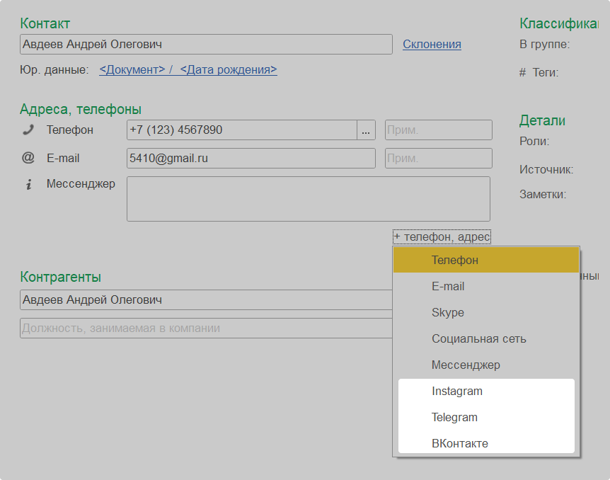 В 1С:УНФ После подключения интеграции у контактов появятся три новых поля в разделе «Адреса, телефоны»: