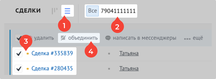 2. Найдите нужные сделки по номеру телефона → выберите их → нажмите «объединить».