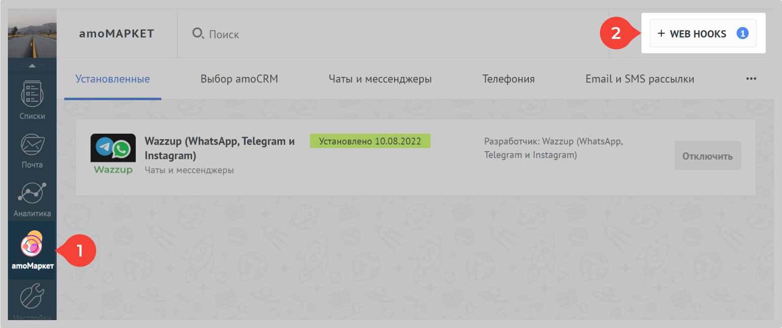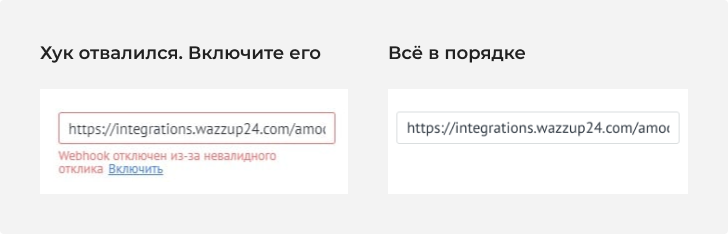 3. В списке ссылок найдите ссылку с доменом integrations.wazzup24.com. Если хук отвалился, под ней будет кнопка «Включить» — нажмите её, и хук снова заработает.