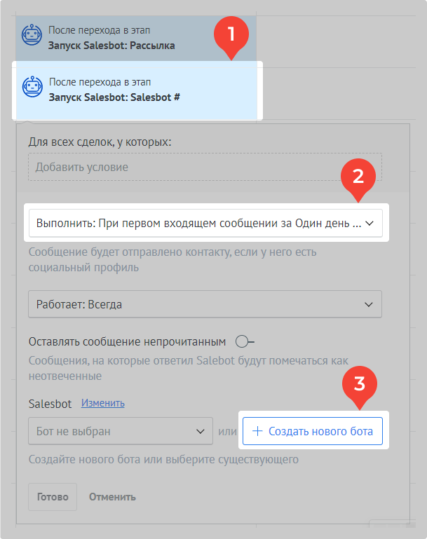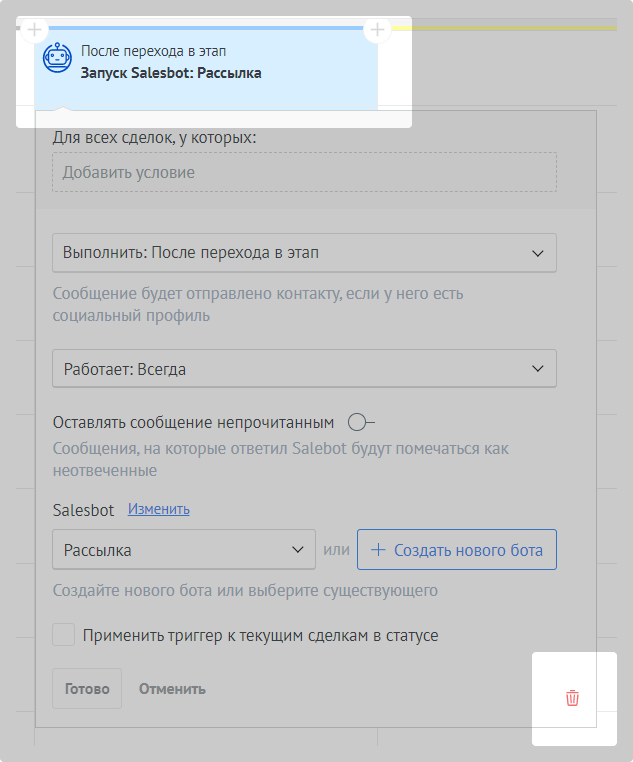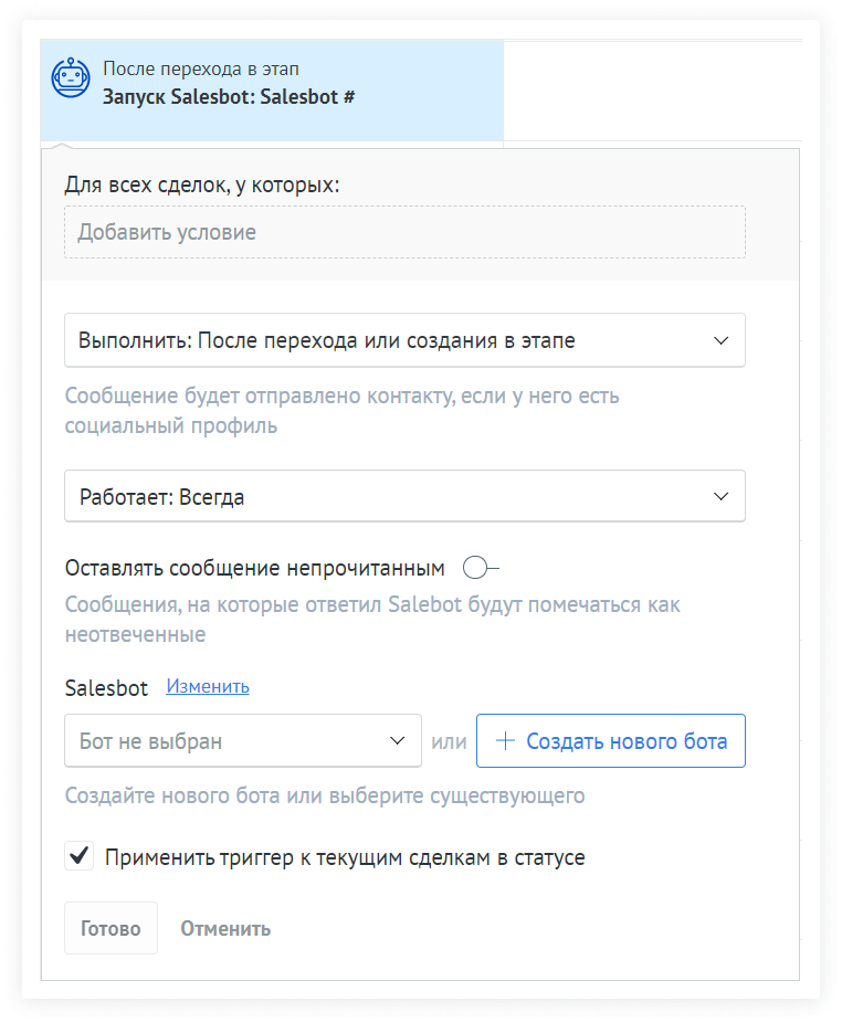 Когда будете создавать бота с рассылкой как в шаге 2, заполните поле «Для всех сделок, у которых» так: