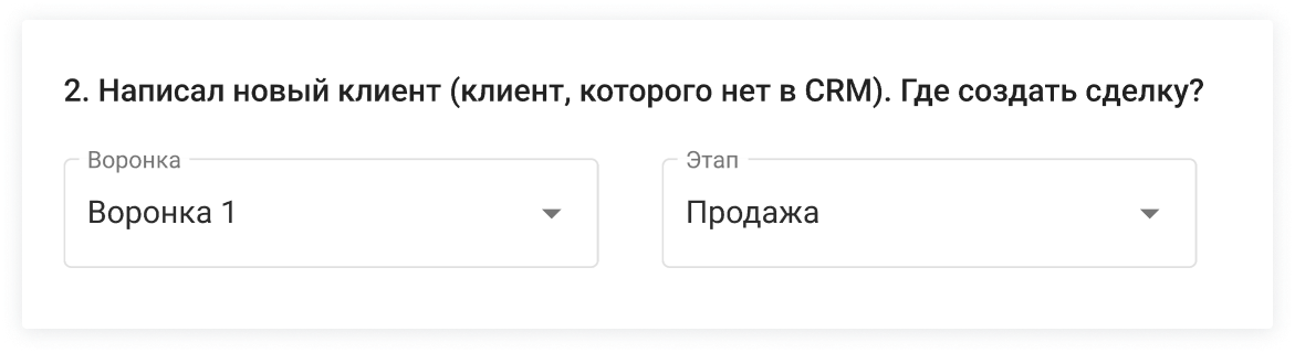 Когда пишет клиент, которого нет в CRM, создается сделка. Необходимо настроить, как новые обращения будут рапределяться между менеджерами и выбрать, в какой воронке будет создаваться сделка. Выбор воронки В интерфейсе Wazzup есть настройка, в которой можно выборать воронку и этапа данной воронки для новых обращений. Воронки и этапы загружаются из CRM.