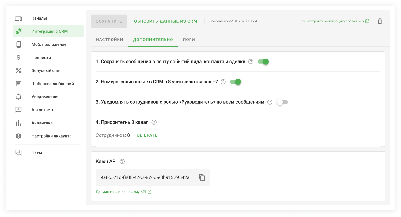 Дополнительные настройки находятся в разделе «Интеграция с CRM» → вкладка «Дополнительно» и действуют сразу на все каналы.