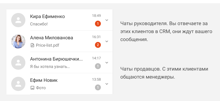 Продавцу с ролью «Руководитель» приходят уведомления только в чатах, за которые он ответственен. Значки «неотвеченных» в таких чатах будут красного цвета.