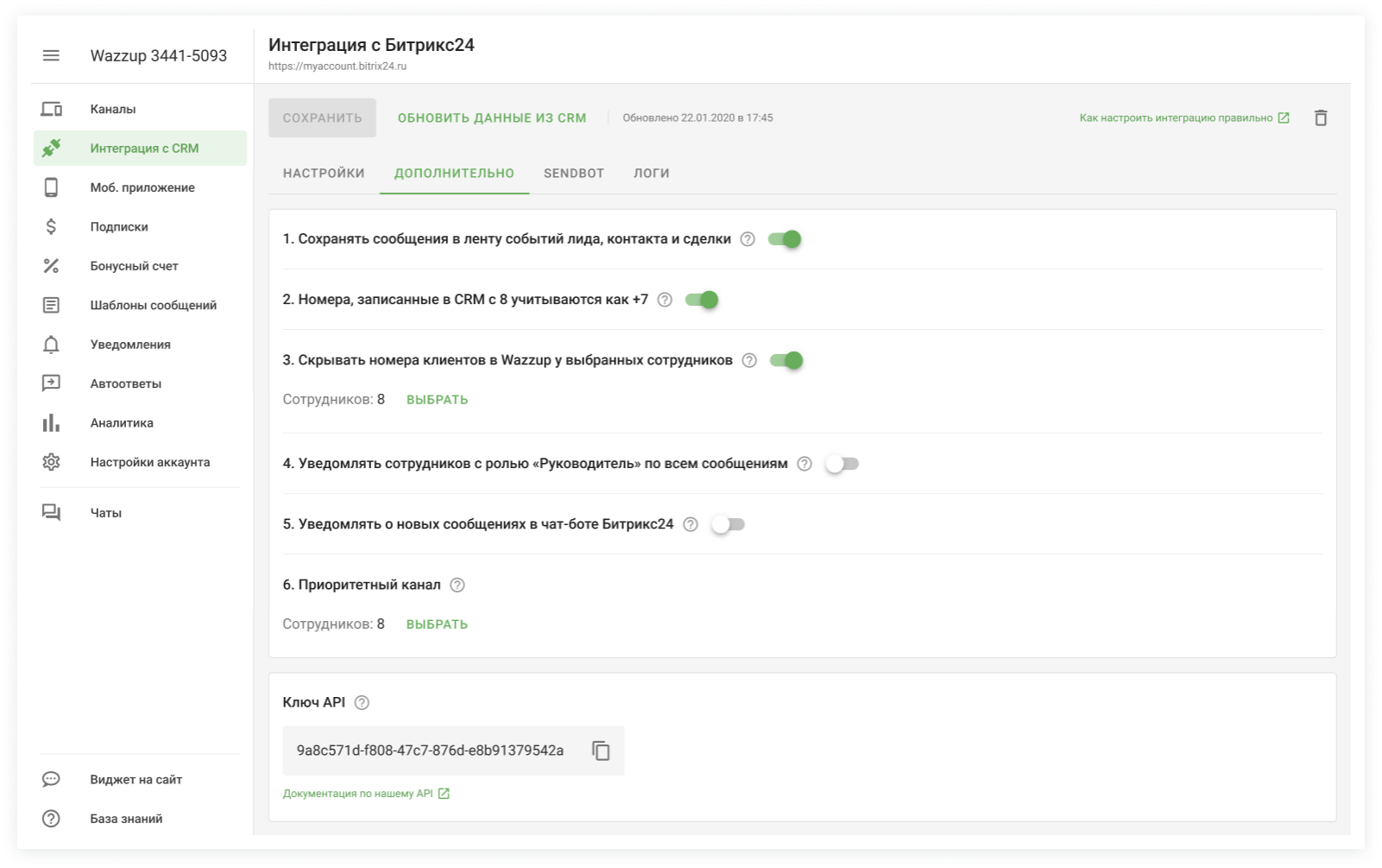 Дополнительные настройки находятся в разделе «Интеграция с CRM» → вкладка «Дополнительно» и действуют сразу на все каналы.
