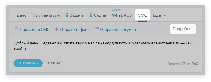 1. Перейдите в карточку. В меню в комментариях выберите действие «СМС» → нажмите «Подробнее».