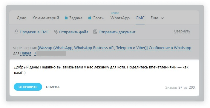 3. Нажмите «Отправить» — сообщение уйдет клиенту. Оно отобразится в комментариях к карточке и в чатах Wazzup.