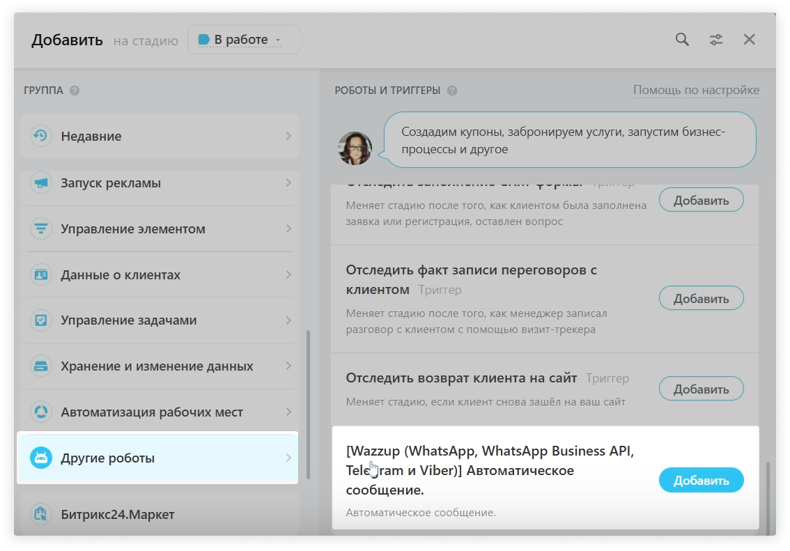 4. В появившемся окне найдите раздел «Другие роботы» → выберите «Wazzup (WhatsApp, WhatsApp Business API, Telegram и Viber) Автоматическое сообщение» → нажмите «Добавить».