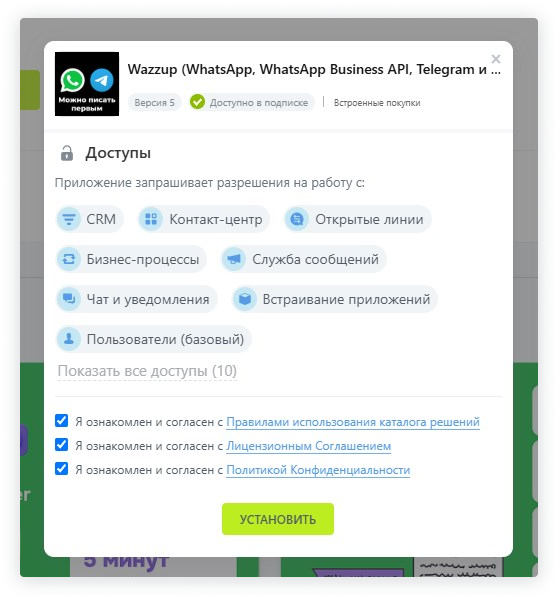 4. Ознакомьтесь с информацией в появившемся окне, правилами использования каталога решений, лицензионным соглашением и политикой конфиденциальности. Затем нажмите «Установить».
