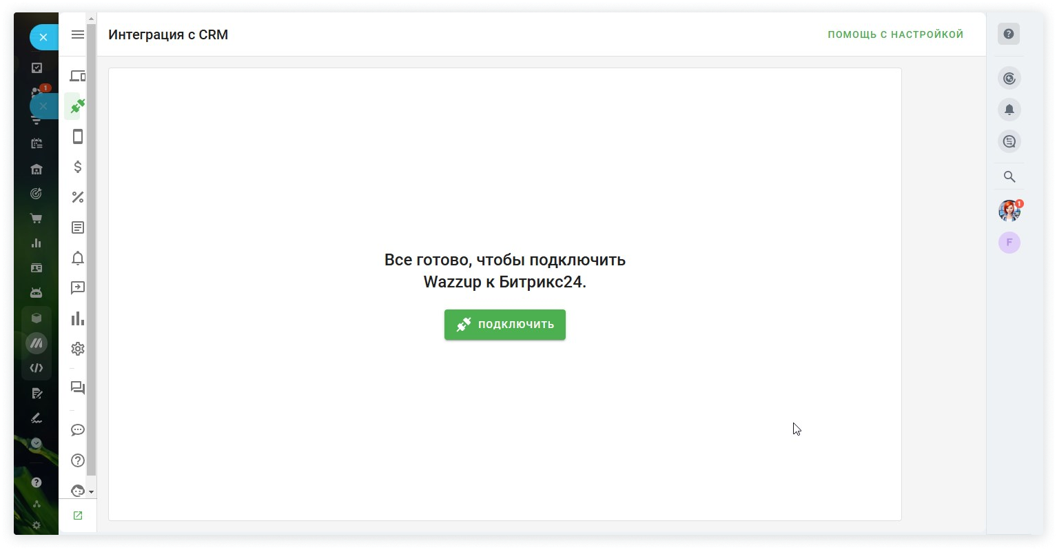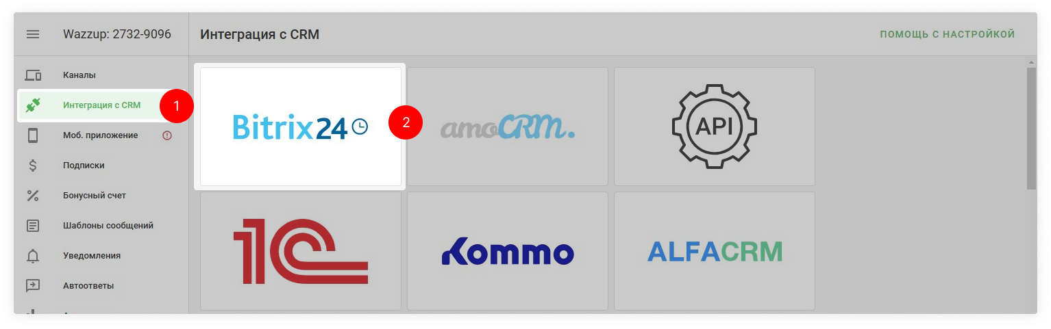 1. Откройте аккаунт Wazzup и перейдите в раздел «Интеграция с CRM» → выберите «Битрикс24».