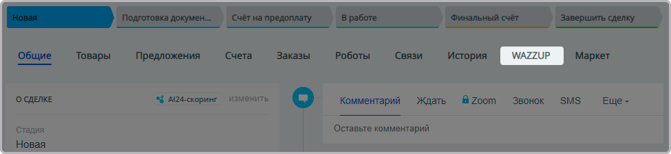 Чтобы открыть чат с конкретным клиентом, перейдите в карточку лида, контакта, сделки. Кнопка перехода в диалог находится на верхней панели меню.