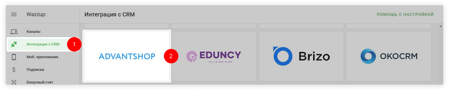 5. В личном кабинете Wazzup откройте «Интеграция с CRM».