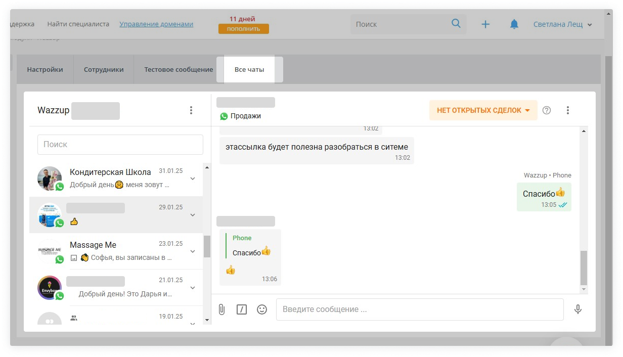 В разделе «Модули» → Wazzup → вкладка «Все чаты» Здесь отображаются все диалоги с клиентами, привязанные к вашему аккаунту Wazzup. Вы можете искать нужные переписки, фильтровать чаты по статусу и сотрудникам.