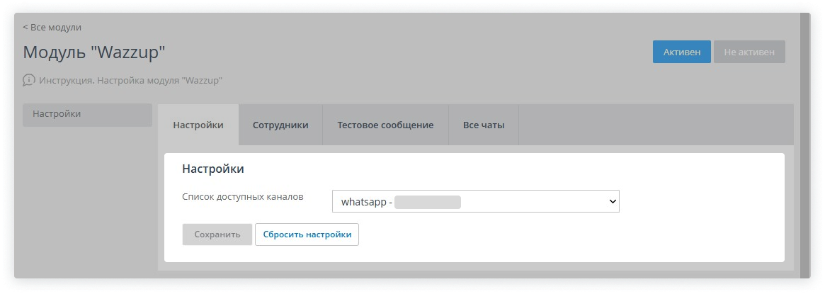 7. Откроется страница настроек модуля. Выберите канал, с которого хотите работать, и нажмите «Сохранить».