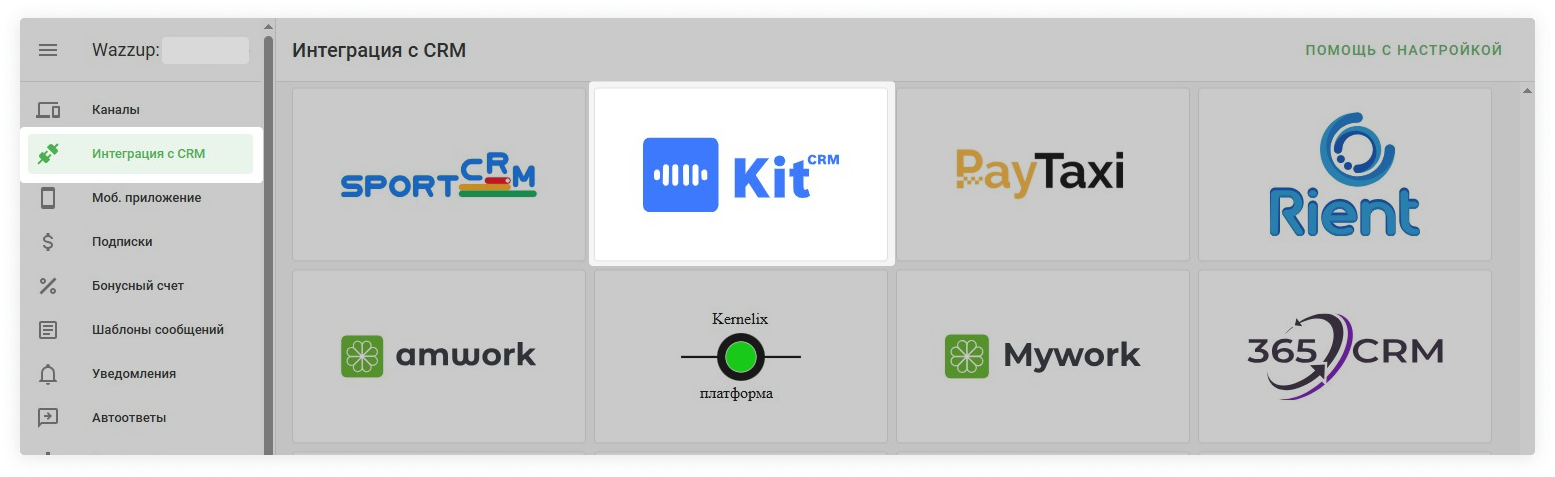 4. После откройте раздел «Интеграция с CRM» → выберите в списке KitCRM.