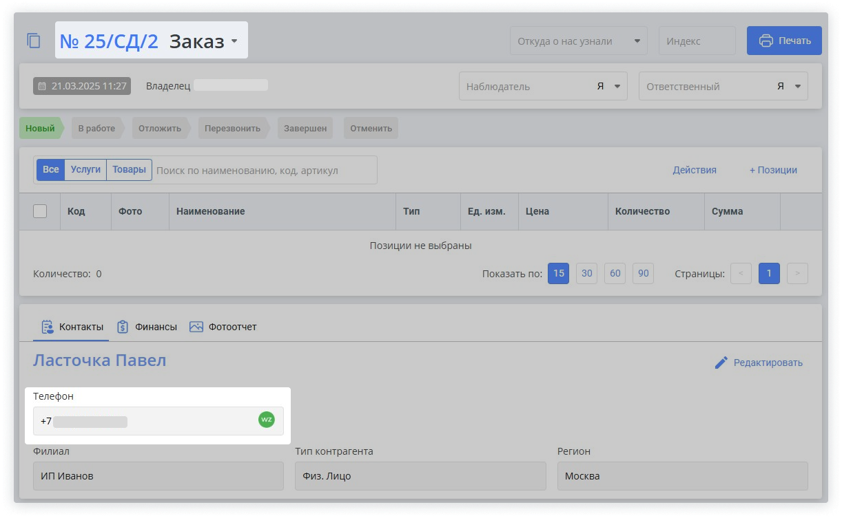 Можно отвечать прямо из KitCRM, использовать шаблоны и отправлять файлы. Для создания нового диалога перейдите в карточку заказа или клиента и нажмите на значок Wazzup напротив номера.