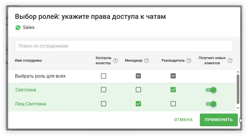 Включите ползунок «Получает новых клиентов» тем сотрудникам, на которых нужно создавать сделки, когда напишут новые клиенты.