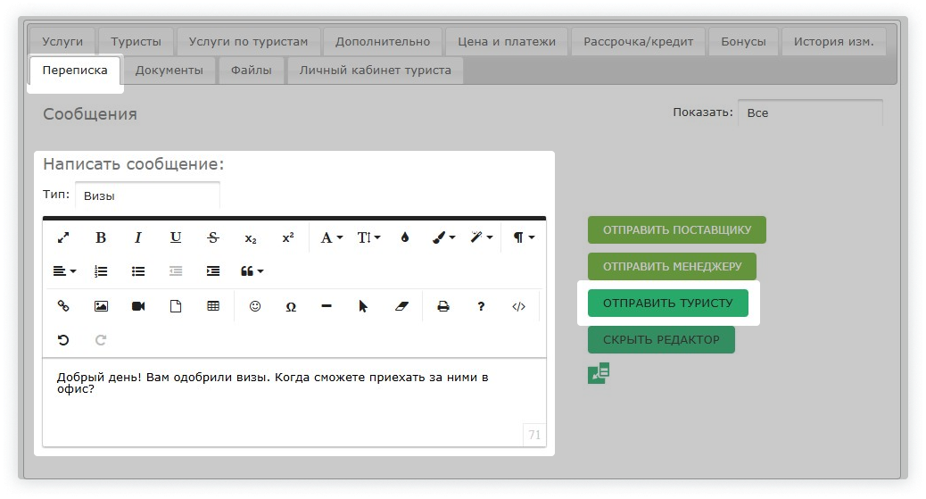 Чтобы написать клиенту, откройте путёвку и перейдите в раздел «Переписка». Введите текст сообщения в поле и нажмите «Отправить туристу».