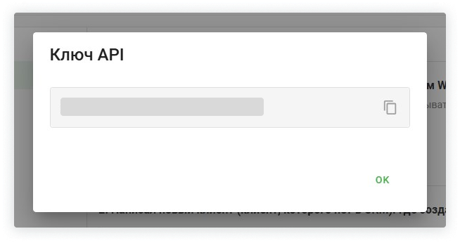 2. Перейдите в раздел «Интеграция с CRM» → выберите API → нажмите «Подключить» → скопируйте API-ключ.