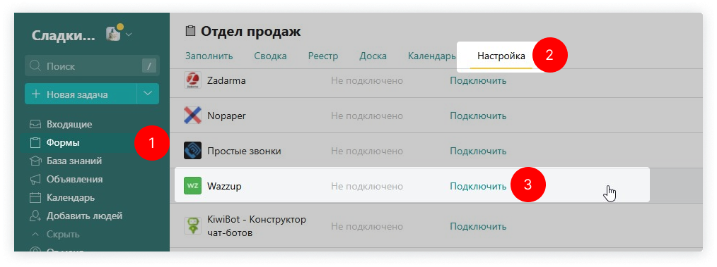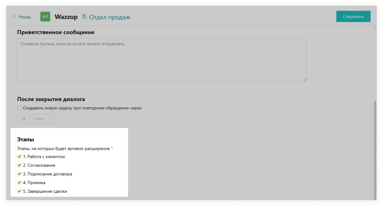 5. Сохраните настройки. Интеграция готова — можно отправлять сообщения клиентам через Wazzup.
