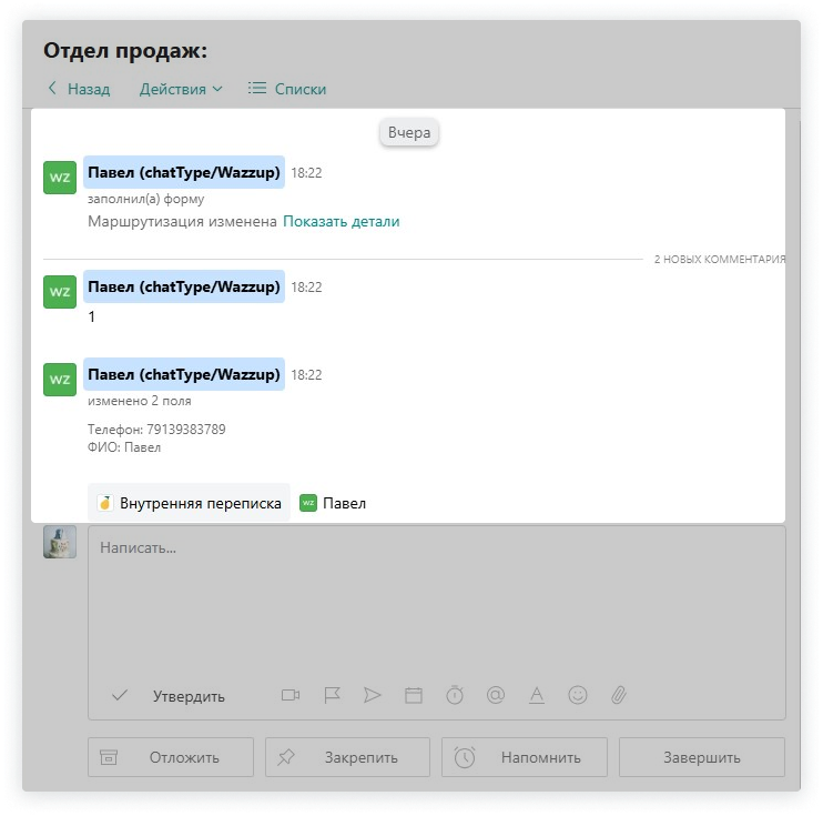 После подключения модуля Wazzup чаты с клиентами будут доступны в нескольких местах. Перейдите в раздел «Входящие» и откройте задачу. В этом окне вы увидите диалог с клиентом, а также вести переписку.