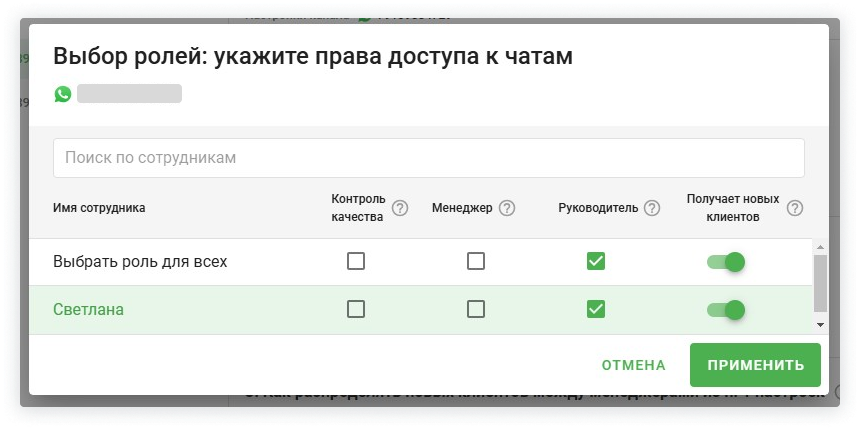7. Чтобы администратор мог просматривать переписку и взаимодействовать с любым клиентом, отметьте роль Руководитель. Нажмите «Применить», а затем «Сохранить».