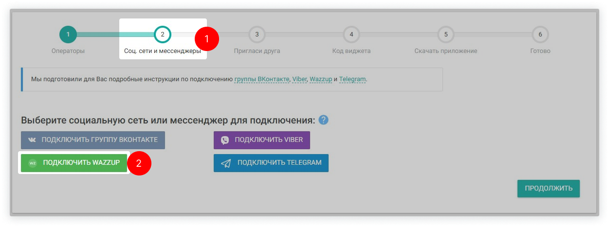 5. Перейдите во вкладку «Соц. сети и мессенджеры», нажмите кнопку «Подключить Wazzup».