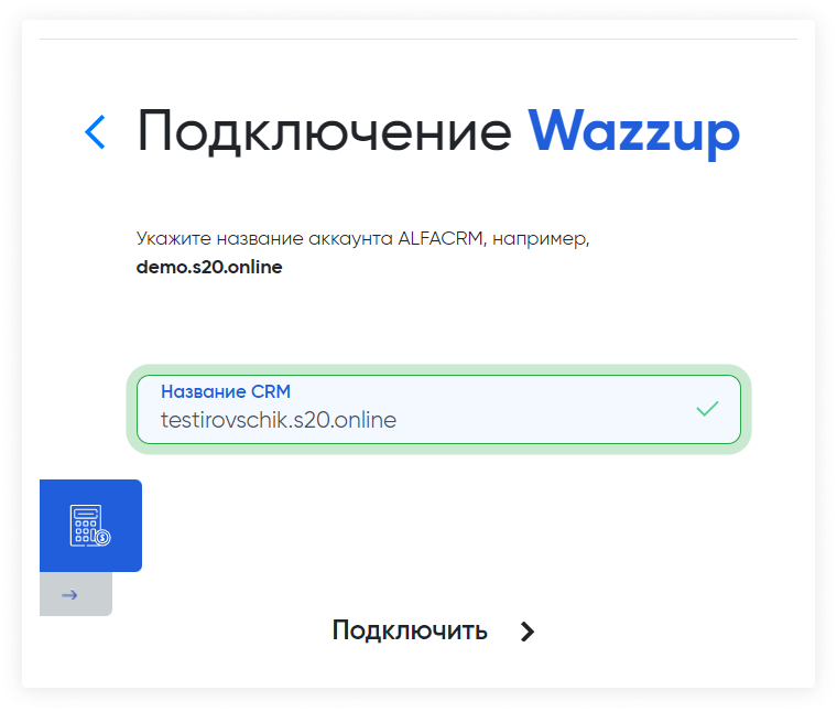 3. Откроется новая вкладка с CRM. Введите название своего аккаунта CRM в формате demo.s20.online → нажмите «Подключить». Название аккаунта можно посмотреть в адресной строке, где прописан URL страницы.