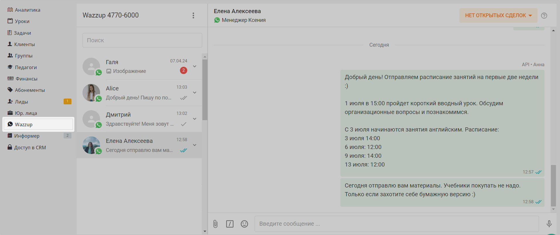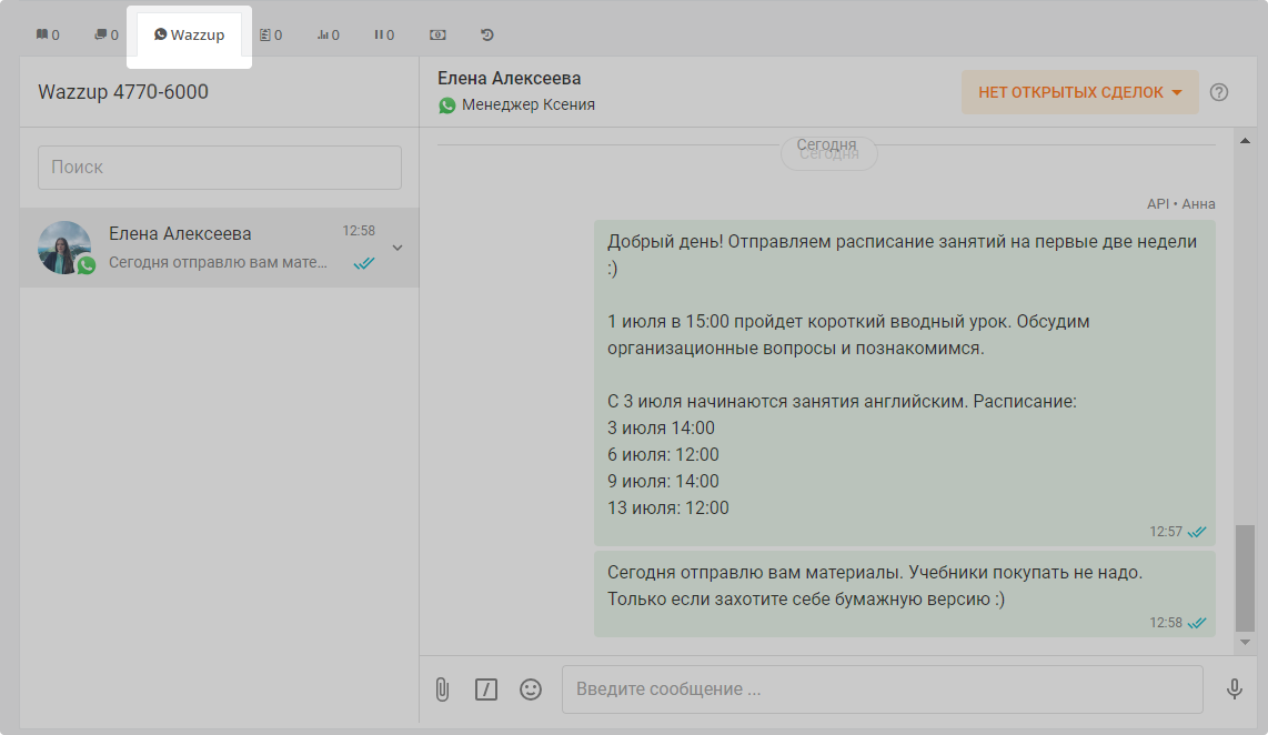 Wazzup позволяет писать клиентам в мессенджеры первыми прямо из CRM. А еще помогает сэкономить время менеджеров: лиды создаются автоматически, когда клиент пишет вам впервые, а из чатов можно отправлять шаблоны и переходить в пару кликов к карточке клиента.