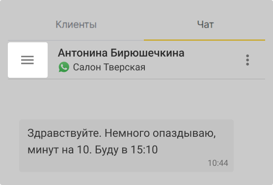 Чтобы открыть диалог из карточки клиента, нажмите на значок WhatsApp в нижнем меню в карточке.