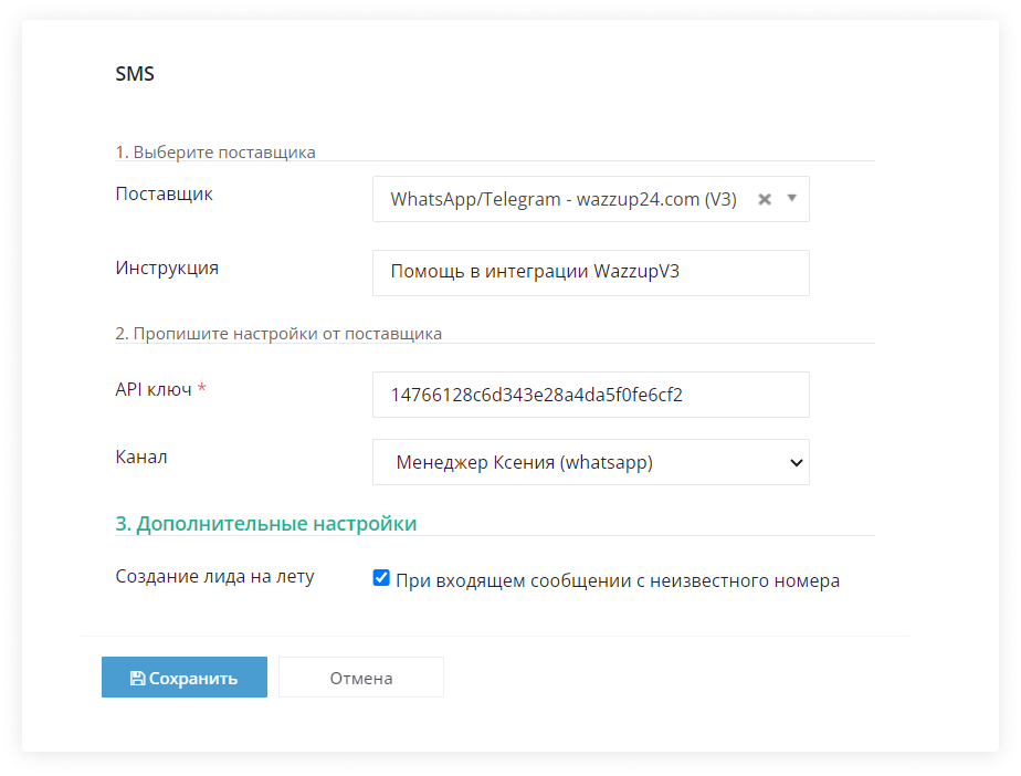 4. Откроются настройки SMS в CRM. Wazzup подключается как провайдер для SMS рассылок, но сообщения будут уходить в мессенджеры.