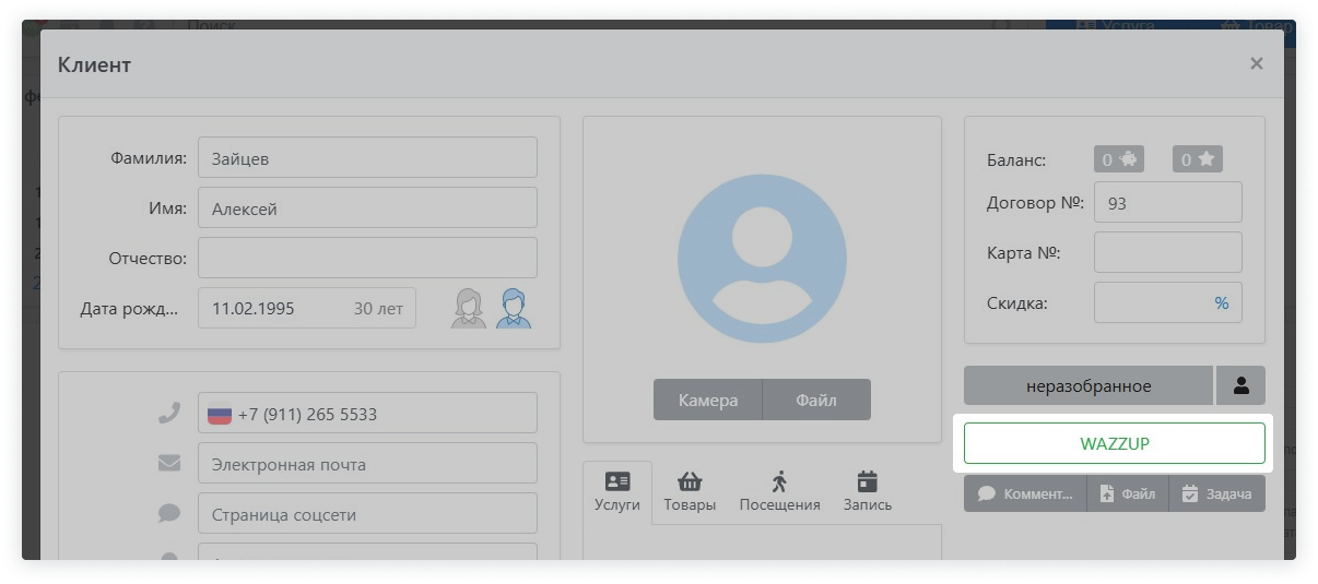 Для начала переписки с клиентом откройте его карточку и нажмите кнопку чата Wazzup.